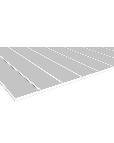 V-Grooved PVC Sheet, with 4" or 6" on-centre grooves. The sheet is 4' wide x ½" thick, with a choice of length. The grooves run along the length of the sheet, and each side of the sheet (running along the length of the sheet) has a shiplap edge, to form a seamless joint.