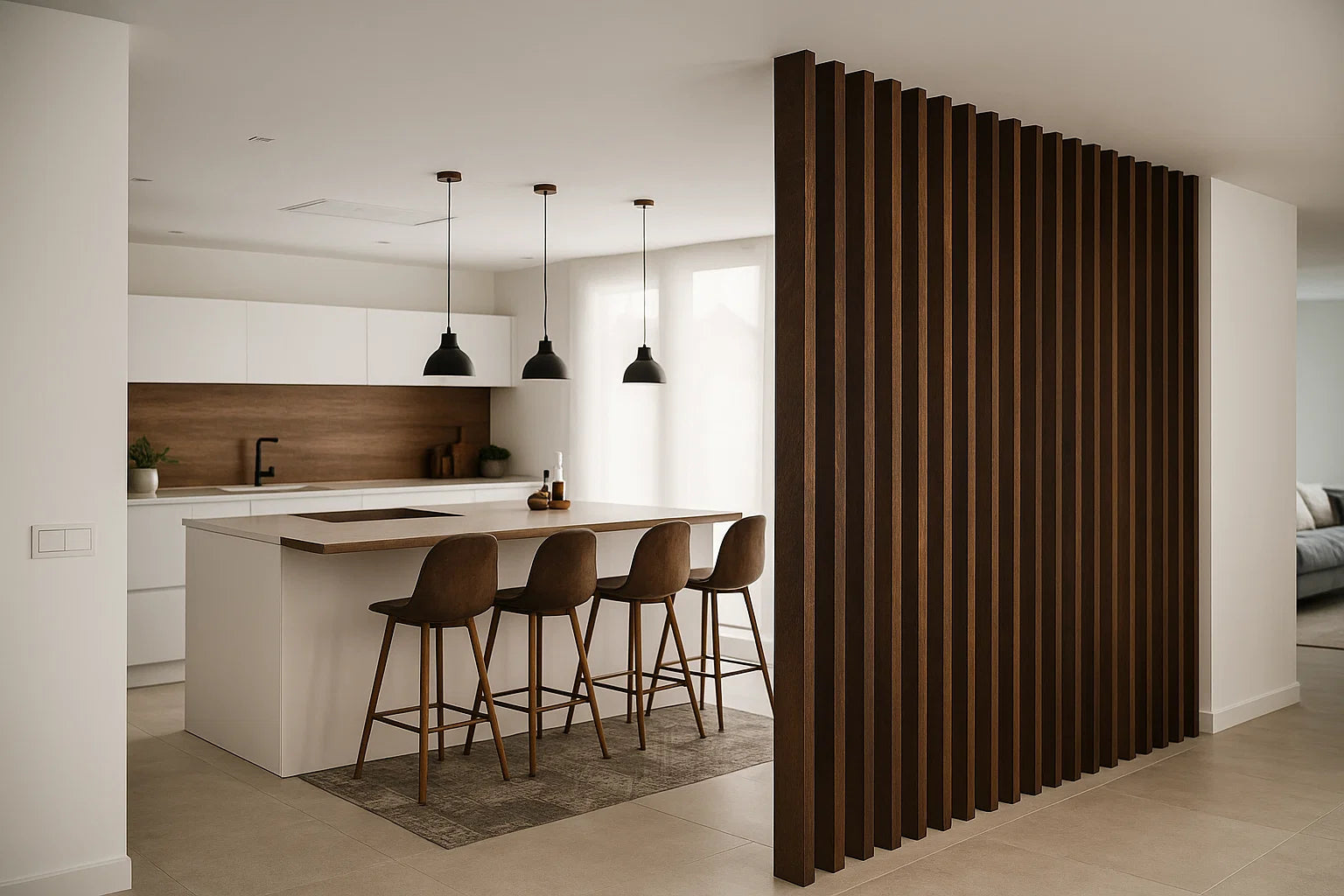 Elevate your interior with our premium Midcentury Hardwood Slat Room Dividers. Crafted from real wood veneer, each slat is available either raw—ready to be finished in the shade of your choice—or prefinished for immediate installation.