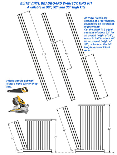 Note that planks may be shipped pre-cut or at the full 8ft length, potentially requiring on-site cutting for customization in lower wainscot applications.
