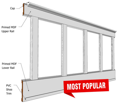 All parts are packed with protective packaging and ready to go for quick shipping. The rails and stiles are made from primed MDF, and the Cap Trim from Pine or Poplar, and the Shoe Trim are made from PVC, both for better impact and moisture resistance.  If you have any doorways or windows, the parts are easily customizable with our Router Bit.
