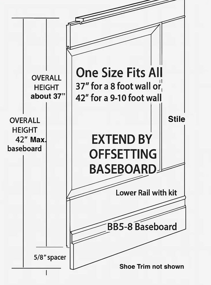 For a 42" high application, a 5/8" thick spacer and baseboard is used to extend the height to 42". Although any baseboard or spacer will do, as a convenience, we offer this package of a 5/8" thick x 2" wide x 8ft raw MDF spacer and a 8 ft length of BB5-8 baseboard (special order) in primed MDF as shown.