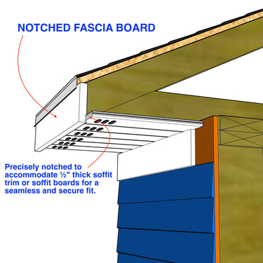 The back is precisely notched to accommodate ½" thick soffit trim or soffit boards, ensuring a clean, secure, and seamless installation. Engineered for long-lasting performance, it resists warping and weather damage. Easy to cut, shape, fasten, and finish with standard carpentry tools.